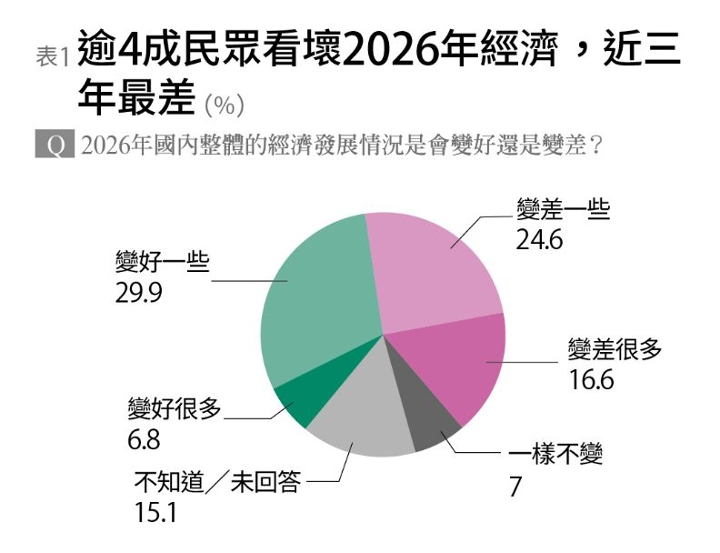 根據《遠見》2026民心動向調查的結果,41.2%民眾認為來年經濟將變差,較2024年底的調查增加6.7個百分點;36.7%民眾認為經濟會變好,較2024年下滑2.6個百分點。不但悲觀看法多於樂觀預期,整體信心更是近三年新低。