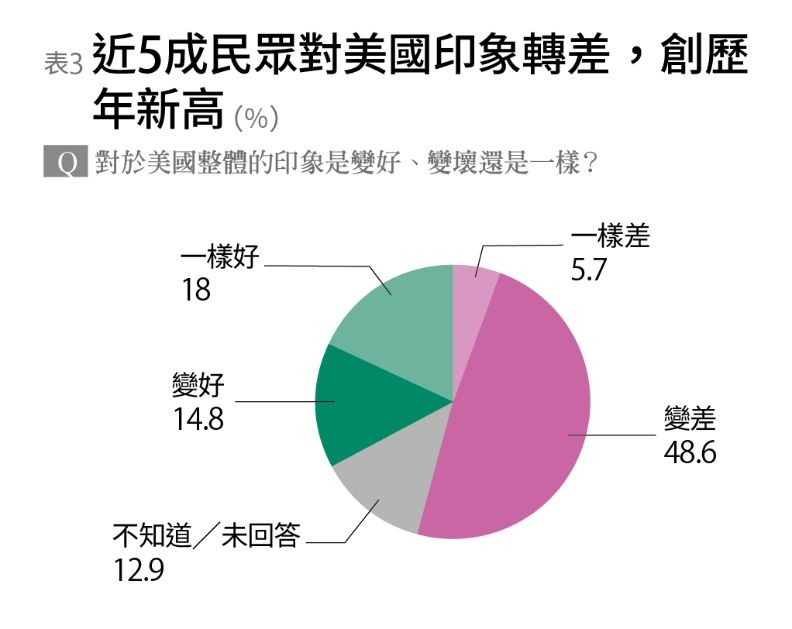 調查顯示,台灣民眾對美國的觀感出現明顯轉折,48.6%受訪者認為對美國印象變差,相較2024年底調查的28.6%,大幅增加20個百分點,創歷年新高;僅14.8%民眾認為對美國印象變好。