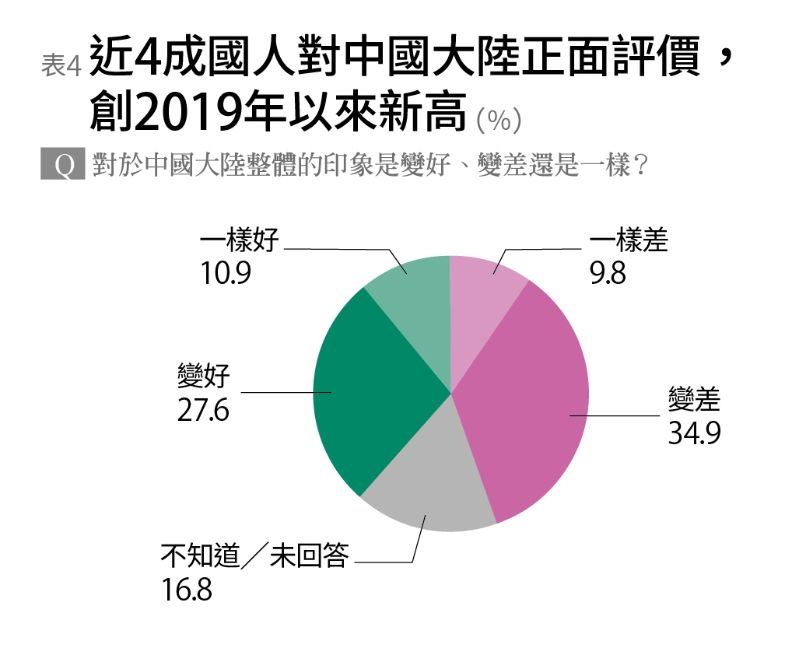 而對中國大陸的印象相對分歧,分別有27.6%變好、34.9%變差。進一步詢問民眾的看法,56.6%認為台灣應「增加與中國大陸互動」,25.9%主張「減少交流」,顯示希望兩岸交流仍是社會主流意見。