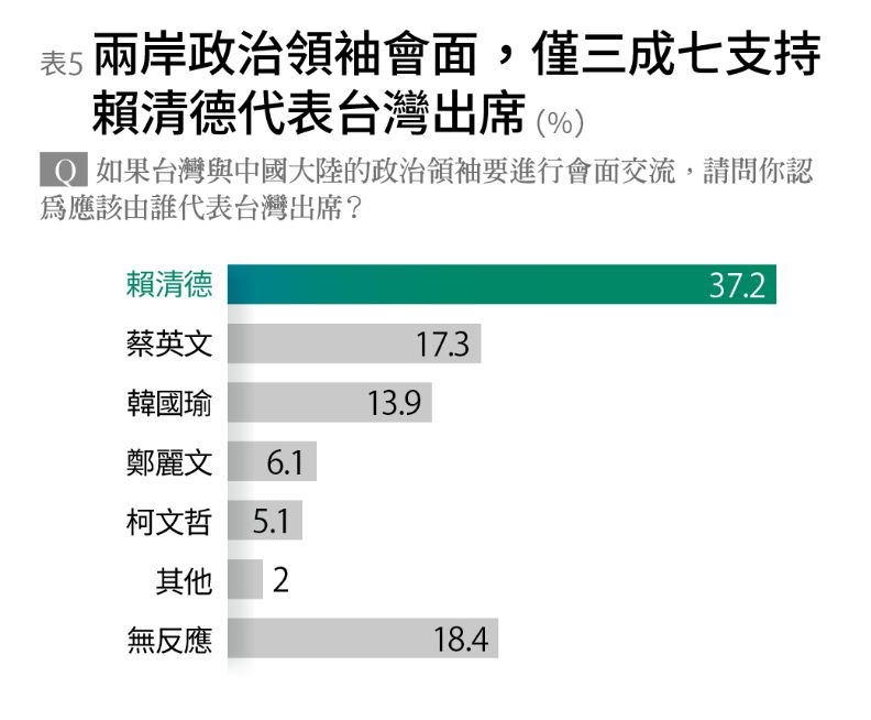 兩岸領袖會面,37.2%支持賴清德代表出席