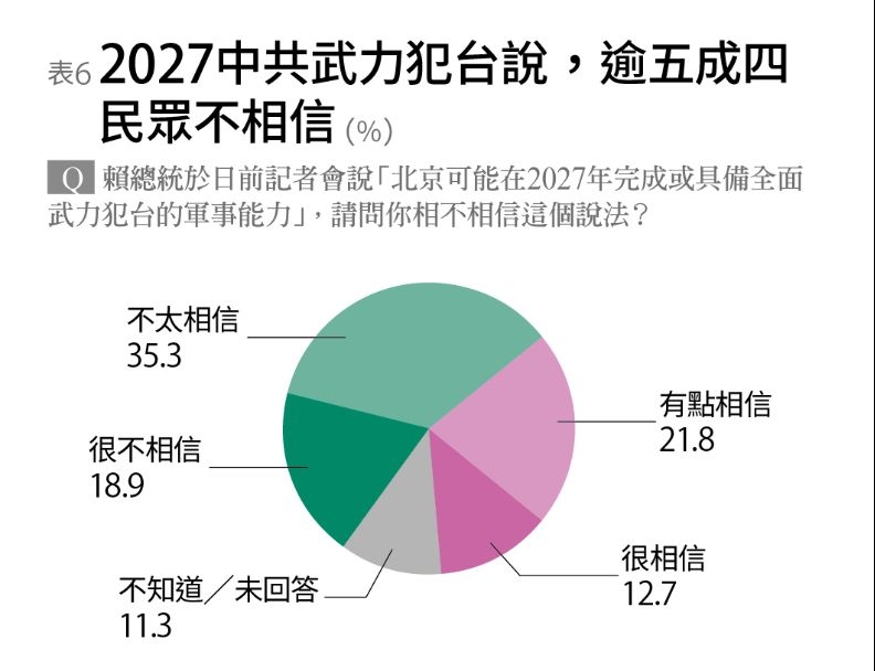 對於總統賴清德日前表示「北京可能於2027年完成或具備全面武力犯台能力」,本次調查指出, 34.5%民眾相信此一說法,54.2%民眾則不相信。顯示多數民眾對短期內發生戰爭的風險評估,抱持相對保守的態度。