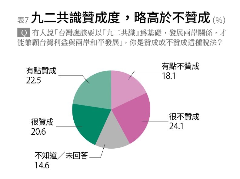 調查也詢問民眾對「九二共識」的看法,有43.1%的民眾贊成以九二共識為基礎來發展兩岸關係,兼顧台灣利益與和平發展;但也有42.2 %的民眾不贊成此看法,與上一次調查(2019年)結果相較變化不大,顯示社會對九二共識的看法仍高度分歧。