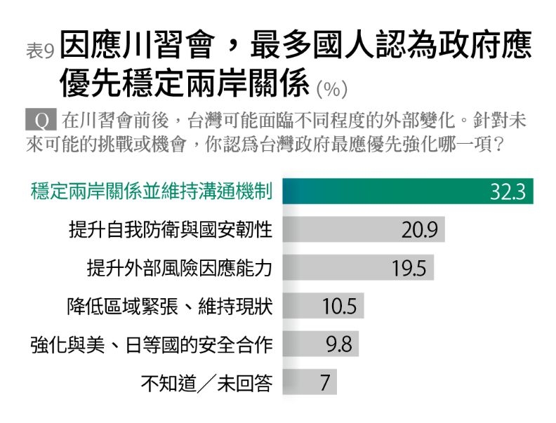 至於如何應對川習會對台灣的可能影響?最多民眾(32.3%)認為政府應「穩定兩岸關係並維持溝通機制」,接著依序是「提升自我防衛與國安韌性」(20.9%)、「提升經濟與產業的外部風險因應能力」(19.5%)、「降低區域緊張、維持現狀」(10.5%)、「強化與美、日等國的安全合作」(9.8%)。